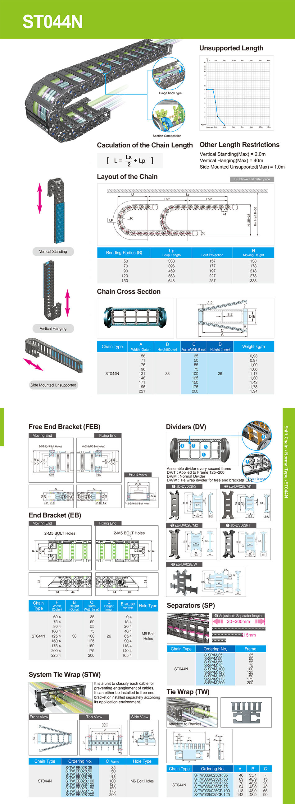 ST 044N 链条材质 CPS酰胺,UL94-HB 速度 3m /秒 加速 10? 温度 -30C?+ 130C 其他安装长度 上方的垂直曲线=最大值2.0?7.0m 下方的垂直曲线=最大值40?150m 侧面安装,无支撑=最大值1.0?4.0m 应用